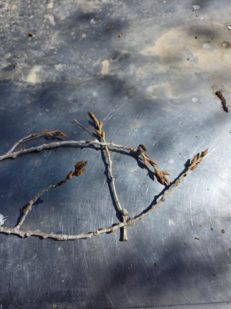 It’s spring! And here, that means wind (OK, well, we have wind all the time, but in the spring it seems to pick up some). Our cottonwood (Populus deltoides) is starting to bud out and the wind does take down a few branches here and there. A short walk will give me quite a few branches like this: