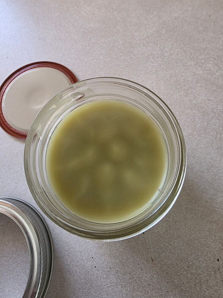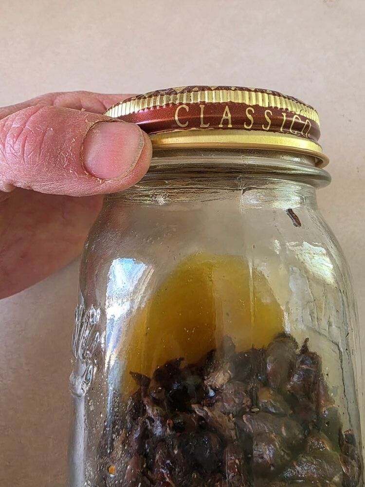 I want buds that are like this or maybe even a little fatter, but not with leaves showing yet. They will feel sticky and pop right off the branch. I usually carry an empty pint jar with me, and pop the buds into it as I walk. When the jar is full (or even if it’s not), cover them with oil. I tend to use olive oil because that’s what I have available, but you could use other oils like jojoba. Put a lid on it and stick it in a dark cabinet until you remember it – longer is better.