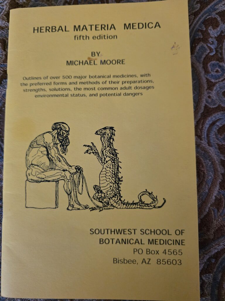 Herbal Materia Medica by Michael Moore. Not really a book, more of a pamphlet. This is the primary source I use for making tinctures. Michael Moore combed through many old sources and texts to find the best ratios for individual herbs. This does not really contain much about the herbs themselves, other than what ratio of herb to alcohol and the percentage of alcohol to use. In my opinion, it’s a must have if you are planning on making your own tinctures.