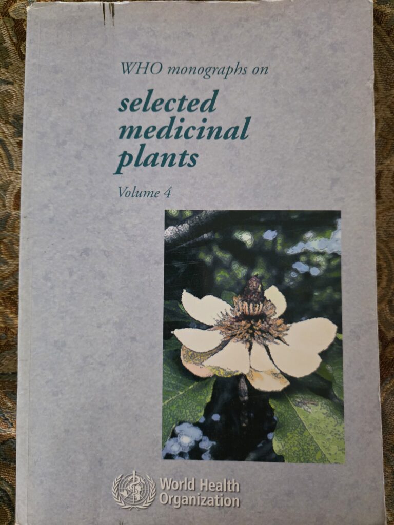 WHO Monographs on Selected Medicinal Plants by the World Health Organization. This is volume 4 of – I don’t know – maybe 9 or 10 by now, although the latest volumes are only available online, not print. While the US doesn’t tend to put a lot of money into studying herbs, other countries and the World Health Organization does. These volumes are arranged like a materia medica (lists of plants) with drawings of chemical structure, lists of various constituents by chemical names, and studies listing all the particulars: number of participants, actual hypotheses that were being tested, and outcomes. These books are not for everyone, but if you are studying herbalism from a more structured evidence-based viewpoint, you may really like them. I think they are great because they allow me to ‘argue’ with people that think herbalism is not a valid medical option.